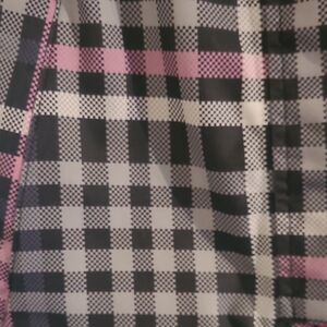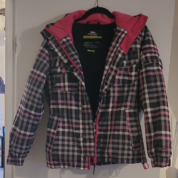 Chic Trespass jacket with a vibrant pink and black checkered pattern. Includes a cozy hood and practical pockets. Great for skiing or snowboarding. Ventilating pockets in armpits.