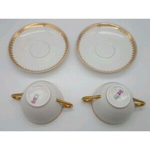 No chips cracks crazing or discolorations. Some wear to gold rims. Set of two cups and saucers.