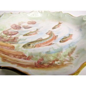 This is a Vintage Tressemanes & Vogt Limoges France Fish Gilt Edge Sardine Tray. Stunning and in incredible condition is the hand painted fish dish. Larger side would hold the fish and the smaller side, the sauce. It has a raised texture when you run your fingers overtop. Embossed scrollwork along all edges. Circa 1892-1907.