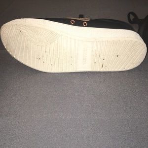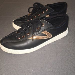 Stylish Tretorn sneakers. Black upper with gold accents. Comfortable and trendy.