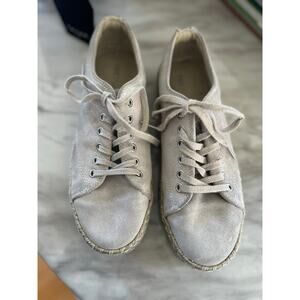 Very good condition, some small smudges to the suede, soles are excellent. Taupe--tan grey with all over glitter. Rope espadrille sole, rubber bottom.