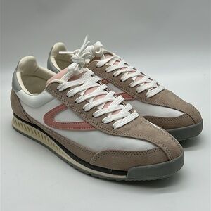 Step into comfort and retro-inspired style with these brand new Tretorn Rawlins sneakers in a stylish Blush colorway. Designed for all-day wear, these sneakers feature a soft suede and synthetic leather upper, a breathable fabric lining, and a memory foam footbed for maximum support. The durable rubber outsole provides excellent traction whether you’re walking around the city or running errands. Perfectly lightweight and versatile with neutral blush, taupe, and white tones that pair well with jeans, shorts, or casual dresses.