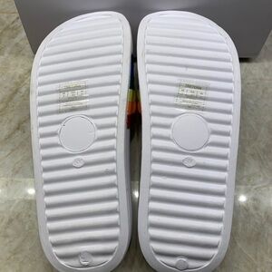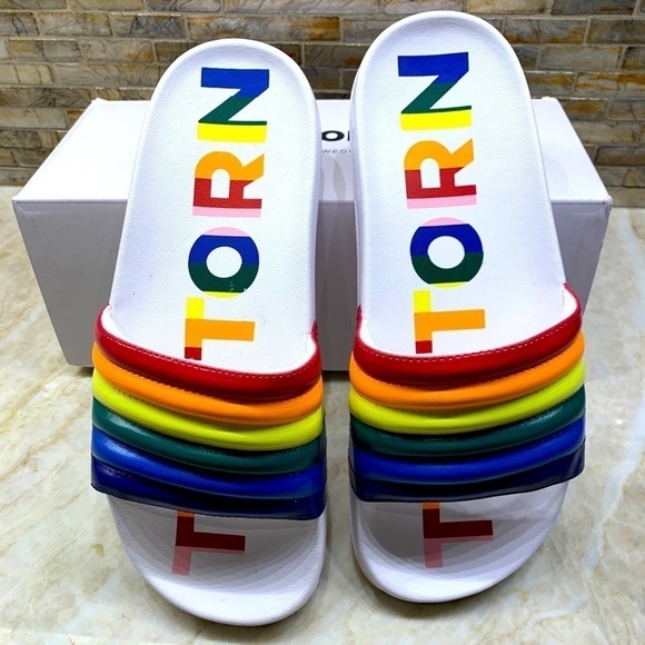 A rainbow vamp adds whimsical detail to this classic slide sandals.