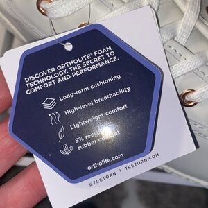 Stylish white sneakers featuring tan accents. Equipped with Ortholite insoles for comfort.