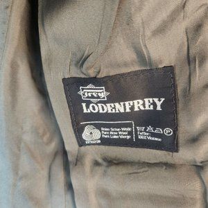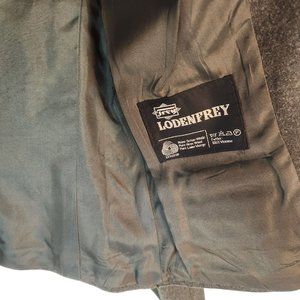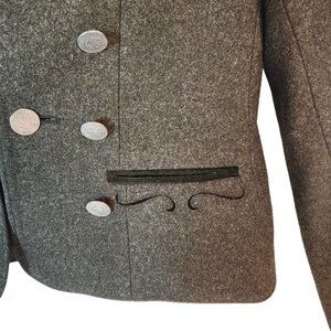 Trey Lodenfrey wool women's jacket in a rich, forest green with dark green velvet trim, cut out detail on lapels and pockets, and silver faux coin buttons.