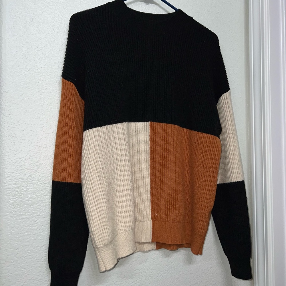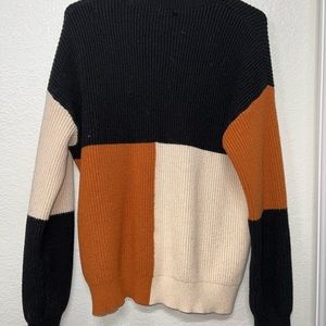 Cozy colorblock sweater composed of black, orange, and cream colors. It will keep you warm during the cool temperatures and layers well under coats and jackets. There is a small hole in the back from where the tags were removed but it can easily be sewn up or hidden by hair.