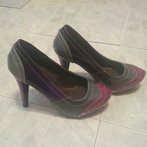 These adorable and classy shoes are full of color to match any outfit. They have a deep/dark fusia pink color on the closed toe and high heel of shoe. They also have a dark gray on part of the shoe by the toe and very back of heel. Then there is deep purple/plum color on mid part of shoe shaft. They are 4-5" tall depending on how you measure your heels. These would make a great collection in your closet to wear with multiple outfits and give that extra flare. Great used shape. Smoke free home!