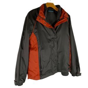 This gray and burnt orange jacket has a fleece removeable liner. The shell is weather resistant made of nylon. The jacket style coat is great for cold weather, It has a zip and snap closure with front zip pockets. This coat came with a hood but no longer ha the detachable hood.