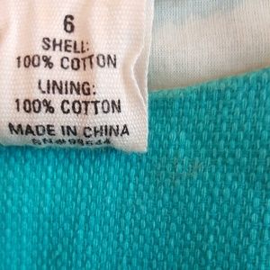 Classic tri colored dress in teal, green, and tan. This beauty has a zipper on the side and is made of a comfortable, breathable cotton. The waist is sinched at a very flattering place and the skirt has a a great shape.