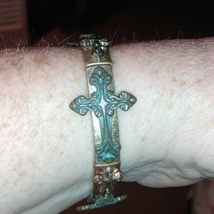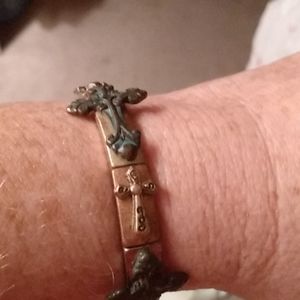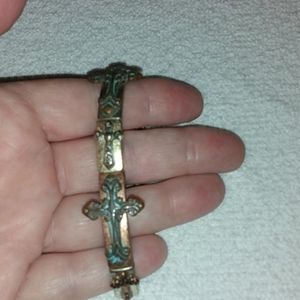 Gold, silver and rose gold bracelet. Very pretty with any outfit. Beautiful crossed of shape and sizes around the bracelet.