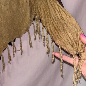 Stylish shawl with fringe detail and metal charm clips. Features brown, tan, and cream colors. Very soft and stylish.