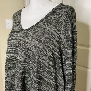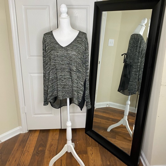 This high low top has Full length sleeves, a v neck, keyhole back with ribbon/bow and half sheer material. Worn 2x. Body: 97% Acrylic/3% spandex. Back: 100% Polyester