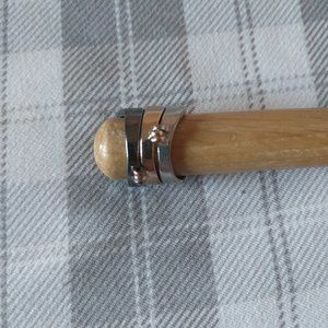 Very lightly used. Faux gold, silver, and chrome. The 3 pieces are connected to each other in the back. Not sure the exact size, but this fits on my index finger and I have skinny fingers.