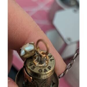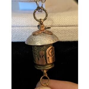 Tri-Metal Federal Gap 45 Ammo Butterfly Birdhouse Pendant on 925 & Crystal Chain. Lovely, unique, one-of-a-kind pendant on a crystal and 925 sterling silver chain necklace. I can't find anything like it on line. Measures 26" long and pendant is 2.25" long. Really sweet with a little butterfly perched on top of the house and a crystal dangle. Vintage sterling spring ring clasp chain. Pre-owned, this necklace is in excellent condition.