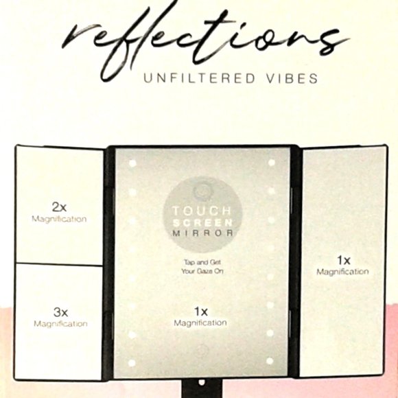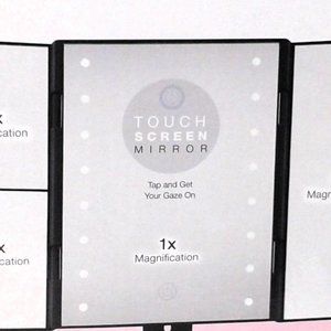 Brand New! Still in the Box! Tri -Panel Mirror with 1X/2X/3X Magnification, Pivot Tilt, Base Tray to Store Accessories, Touch Control for Power & Lighting, Box Dimensions are 11' H x 3' W x 7' L (Tabletop), Battery Operated (4 AAA Batteries Not Included)
