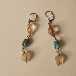 These are handmade dangle earrings featuring turquoise and what appear to be citrine or clear quartz stones, wrapped in wire. Clasp closure. 2 1/2 inches long.