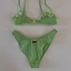 LIKE NEW - A deep scoop crop bikini top with matching high waist bottoms in green velvet. Strappy crop top with adjustable shoulder straps and back clasp fastening. Color most resembles the model photo.