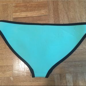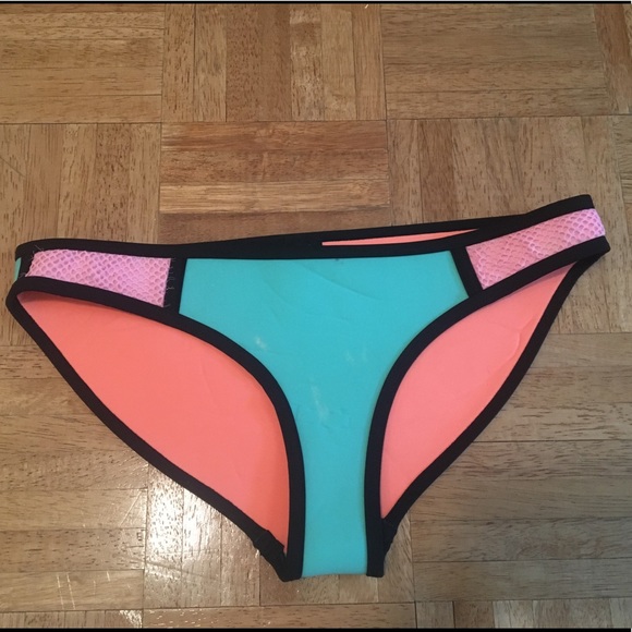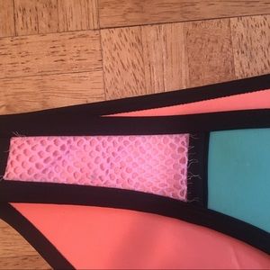 Neoprene bathing suit bottom in mint color with pink mesh on the sides. Some stains and frays, but all shown above. If purchased with matching top it is a $35 deal.