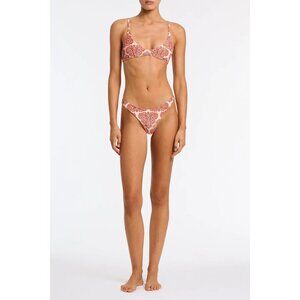 Description from retailer: The deep scoop crop bikini top in paisley printed velvet boasts a strappy design with adjustable shoulder straps and back clasp fastening, ensuring a perfect fit. Paired with matching high waist bottoms, this set offers options for cheeky to normal coverage. A neoprene zip bag is included for convenient storage. Ideal for making a stylish statement by the pool or beach, this swimwear is perfect for endless summer vibes.