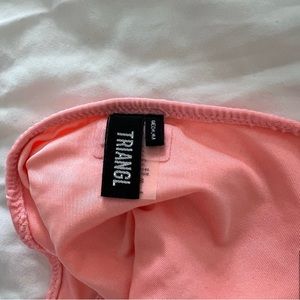 Stylish pink bikini set. Features textured fabric. Perfect for beach days.