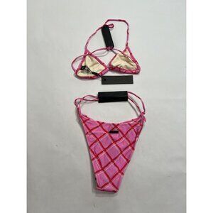 Description from retailer: Embrace the essence of summer with this stunning side-tie bikini in pink printed velvet. Featuring a fully adjustable triangle top and bottoms with self-tie fastenings, this versatile piece offers comfort and style. Choose between cheekiest or cheeky bottoms to suit your vibe. Complete with a chic neoprene zip bag, it’s perfect for a beach day or a pool party. Elevate swimwear collections with this flirty and fun option that promises endless summer vibes.