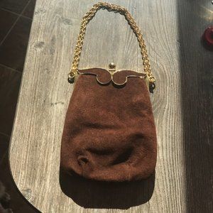 Suede feel chocolate brown handbag , gold chain , snap close. Inner storage pocket .