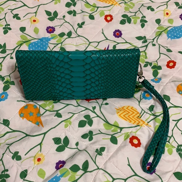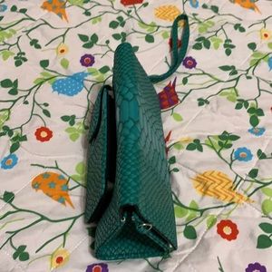 This new without tags small teal faux reptile purse is designed to help you stand out and has it all: an outside pocket for easy phone access, a built in mirror and nooks and a zip up cranny for your cards and cosmetics.