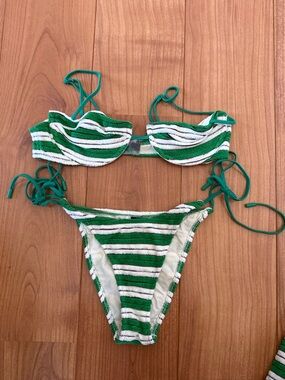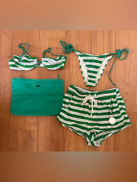 ALL pieces included (top, bottom, shorts and bag) towel like material