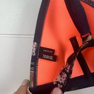 Dark blue floral bikini top with neon orange inside. Adjustable straps Size M