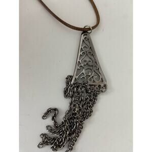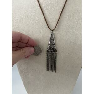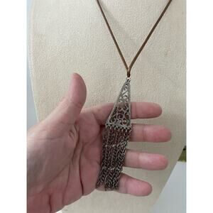 Pretty Upcycled triangle tassel pendant in good condition flaws as pictured on a new olive green rope chain great for school work going out parties vacation tribal jewelry boho retro twee streetwear