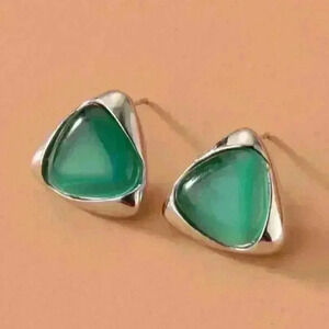 This modern jewelry set features a triangular green stone pendant paired with matching earrings, all encased in a sleek silver frame. A perfect blend of simplicity and elegance for a refined look