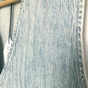 Beautiful Ms. Sofiane Denim Vest, the epitome of allure for all denim enthusiasts. The incorporation of added stretch not only enhances its irresistible comfort but also promises a seamless and flattering fit. This one of a kind vest combines style and comfort in one irresistible package. What truly distinguishes this piece is the delicate crystal pin-stripe detail adorning the entirety of the vest.