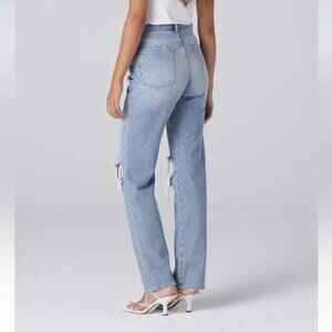 Triarchy Ms. Triarchy Lightweight Destroyed Light Indigo Jeans 28". Light wash distressed straight leg jeans. high rise. brand new, never worn. distressed ripped knees. 5 pokcet design. zip and button closure. waist is 13.5" across, rise 13", inseam 33"