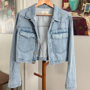 - Triarchy "Stirrup" jacket featuring a western-inspired yoke in a light wash denim