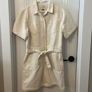 NWOT- never worn, off white denim with a button down front and tie waist. Four pockets in the front and two in the back! Such a fun addition to your wardrobe!