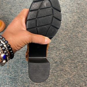 Suede and comfortable with fringes hanging off the outer side, zips on the inside, so once you tie to fit your foot, no more tiring, just zip on
