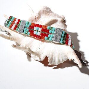 Embrace a touch of tribal elegance with this silvertone bracelet featuring vibrant turquoise, red, and blue glass beads. The secure lobster clasp ensures a perfect fit for any occasion.