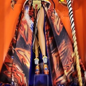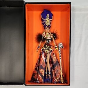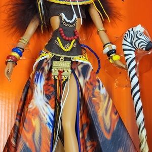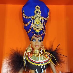 Tribal Beauty Gold Label Barbie Collection's Global Glamour High Fashion Doll is a striking, NRFB (Never Removed From Box) collectible. This vibrant, high-impact doll showcases bold tribal-inspired design with luxurious details, making it a must-have for collectors seeking a unique and glamorous statement piece. Stunning fashion doll in a regal outfit. Features a vibrant purple headdress and a striking black and orange gown. Intricate gold and silver details enhance the look.