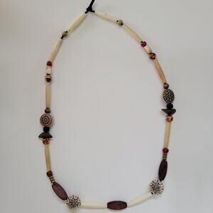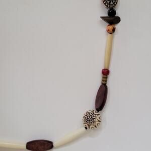 Tribal Boho Beaded Necklace With Carved Wood Bone Style Beads And Earthy Accents