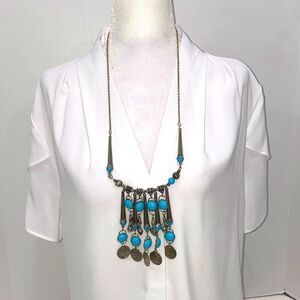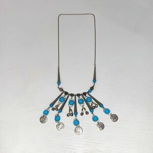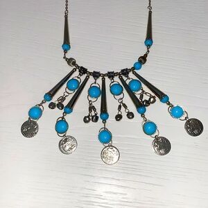 Tribal Coined Bob Bellydancer Blue Silver Toned Necklace Statement Piece