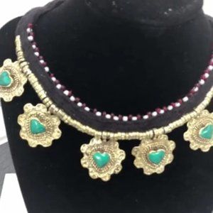 It is a handmade custom necklace, a reproduction of mid-19th century tribal ornament. The necklace is available in different stone colors including, red, blue, and ferozi.