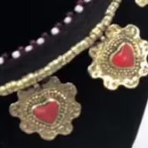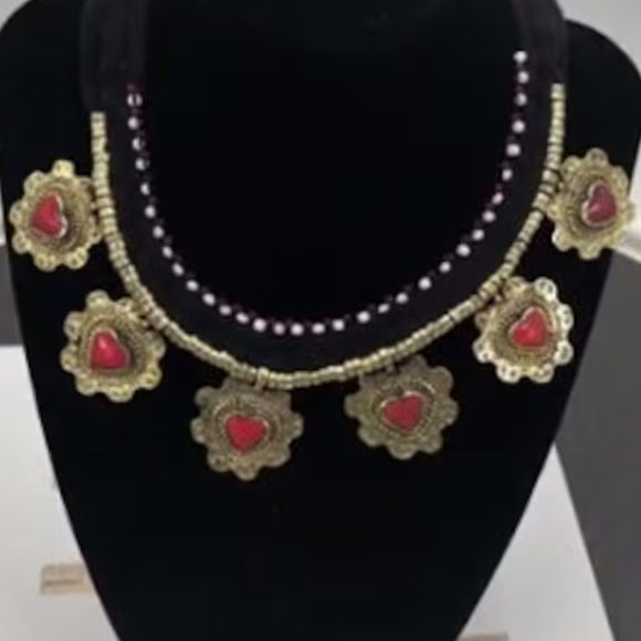 It is a handmade custom necklace, a reproduction of mid-19th century tribal ornament. The necklace is available in different stone colors including, red, blue, and ferozi.