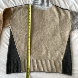 Color-block mock-neck pullover sweater. Relaxed fit with drop shoulders. Front panel is beige with dark charcoal panels at the sides and back. One sleeve is heather grey, one sleeve warm camel brown. Light blue mock neck. Ribbed hem, cuffs, and collar. Super soft and stretchy.