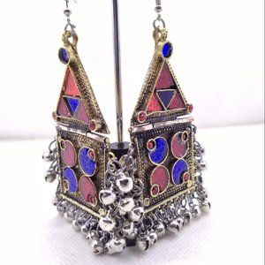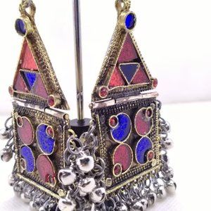 Tribal Dangle Earrings With Bells, Kuchi Vintage Massive Red and Blue GlassStone