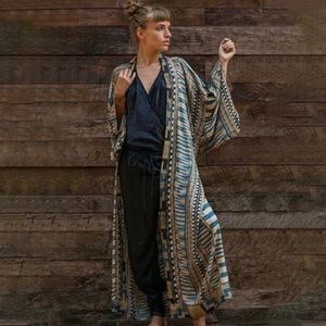 Tribal ethnic printed cotton long length maxi duster kimono wrap with self tie belt. Perfect as a swim coverup or layered over an outfit for some extra style!