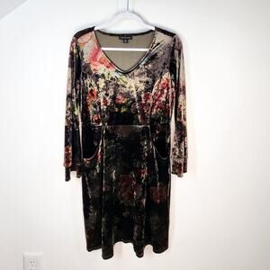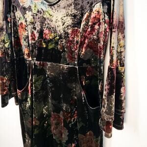 - Description: Dark purple, red and green floral patterned knee length dress with boho style; v-neck neckline; velvet material; pockets at front