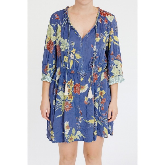 Keywords: Tribal Femme, Floral Dress, Bohemian Dress, Ruffle Trim Dress, Tie Neck Dress, Long Sleeve Dress, Small Dress, Periwinkle Dress, Casual Dress, Spring Dress, Summer Dress, Floral Print, Boho Style