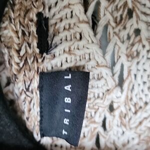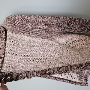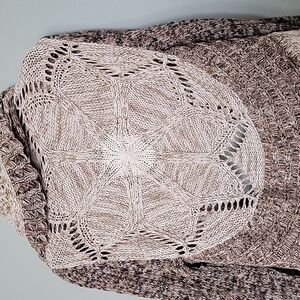 Heavy chunky knit sweater. Has a Star knit pattern in the center of the back. There is no size tag so please see measurements. Shawl collar. Neutral cream and brown tones. Open knit. The pattern reminds me of a crochet blanket from the 70's that drapes over a chair. Neutral, casual, retro, fall, artsy, mature, earthtones, earthy, grandmacore, festival, concert, pointelle, art to wear