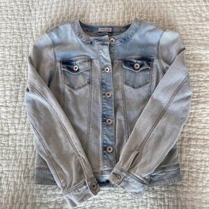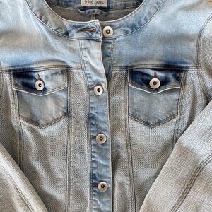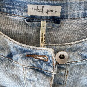 Light wash jean jacket by Tribal, with stylish details and fabric contrasts. Only worn a few times, in great condition. Size small and runs true to size. 98% cotton and 2% spandex.