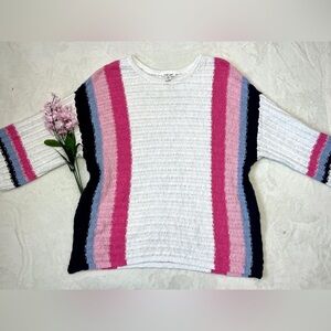 Tribal Jeans branded sweater in white ivory color with colorblocks of pink, pastel pink, lavender and navy, oversized fit, semi-open knit fabrication, drop shoulder, 3/4 sleeve, rounded neckline, side slit hem.